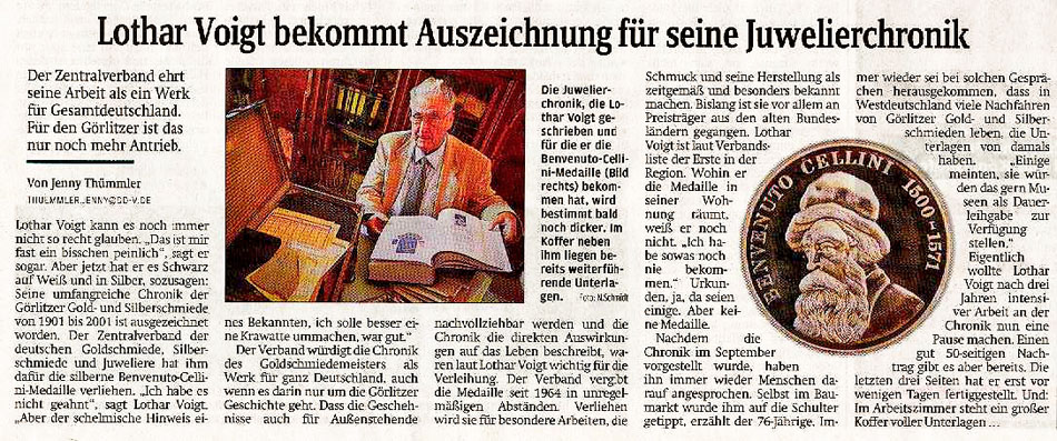 „Die Görlitzer Gold- und Silberschmiede und ihre Vereinigungen von 1901 bis 2001/07“ ist eine Dokumentation der besonderen Art. Gute Planung und deren konsequente Umsetzung führten zum Erfolg. Die Autoren Lothar Voigt und Klaus Jürgen Beil hatten es sich zum Ziel gesetzt, anstelle einer drögen Aneinanderreihung von Jahreszahlen eine interessante, abwechslungsreiche und ansprechende Dokumentation zu erstellen, in der die Geschichte der Gold- und Silberschmiede der Region auch für Branchenfremde in nachvollziehbarer Weise dargestellt wird.